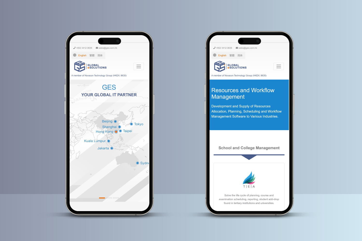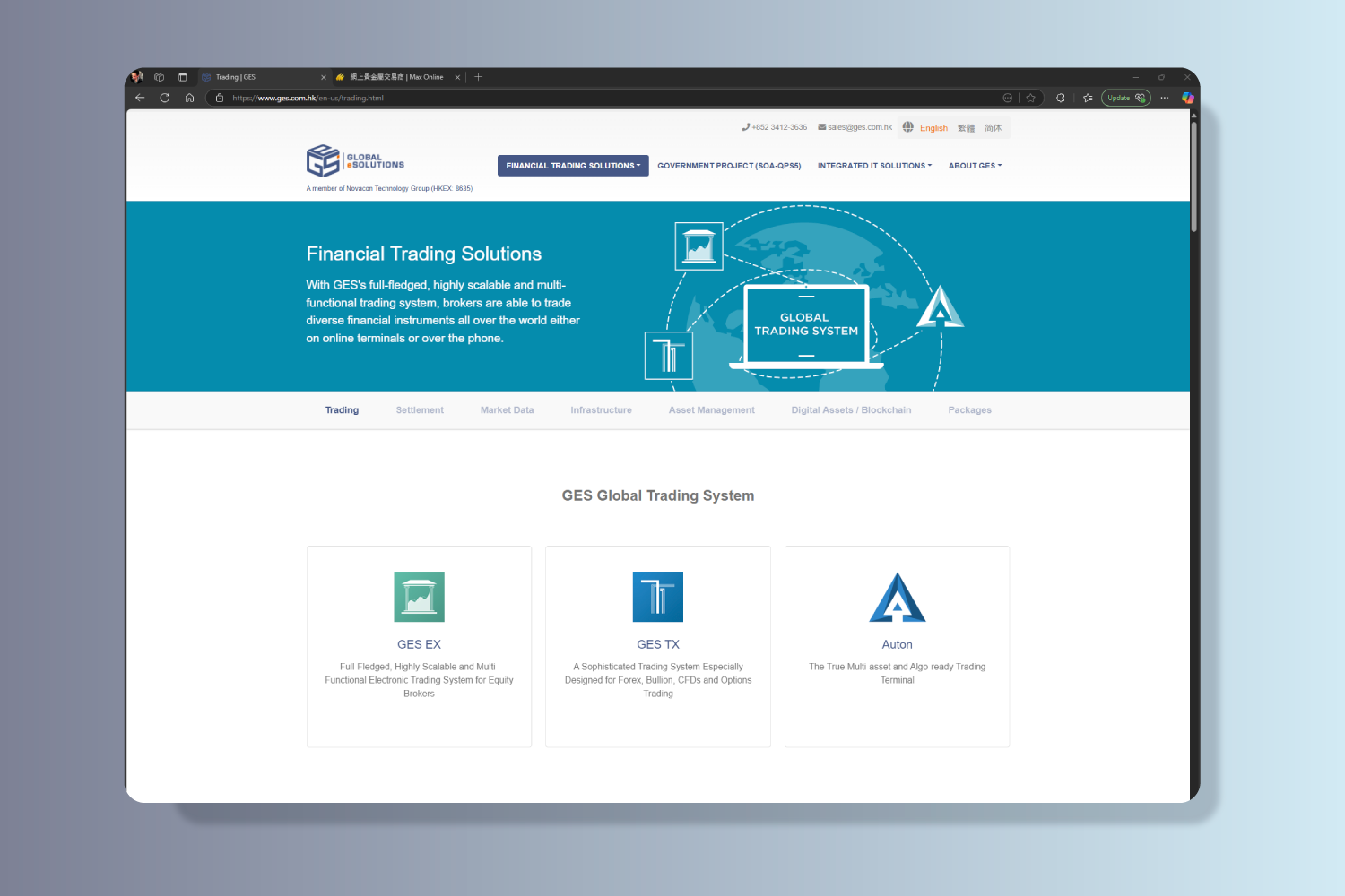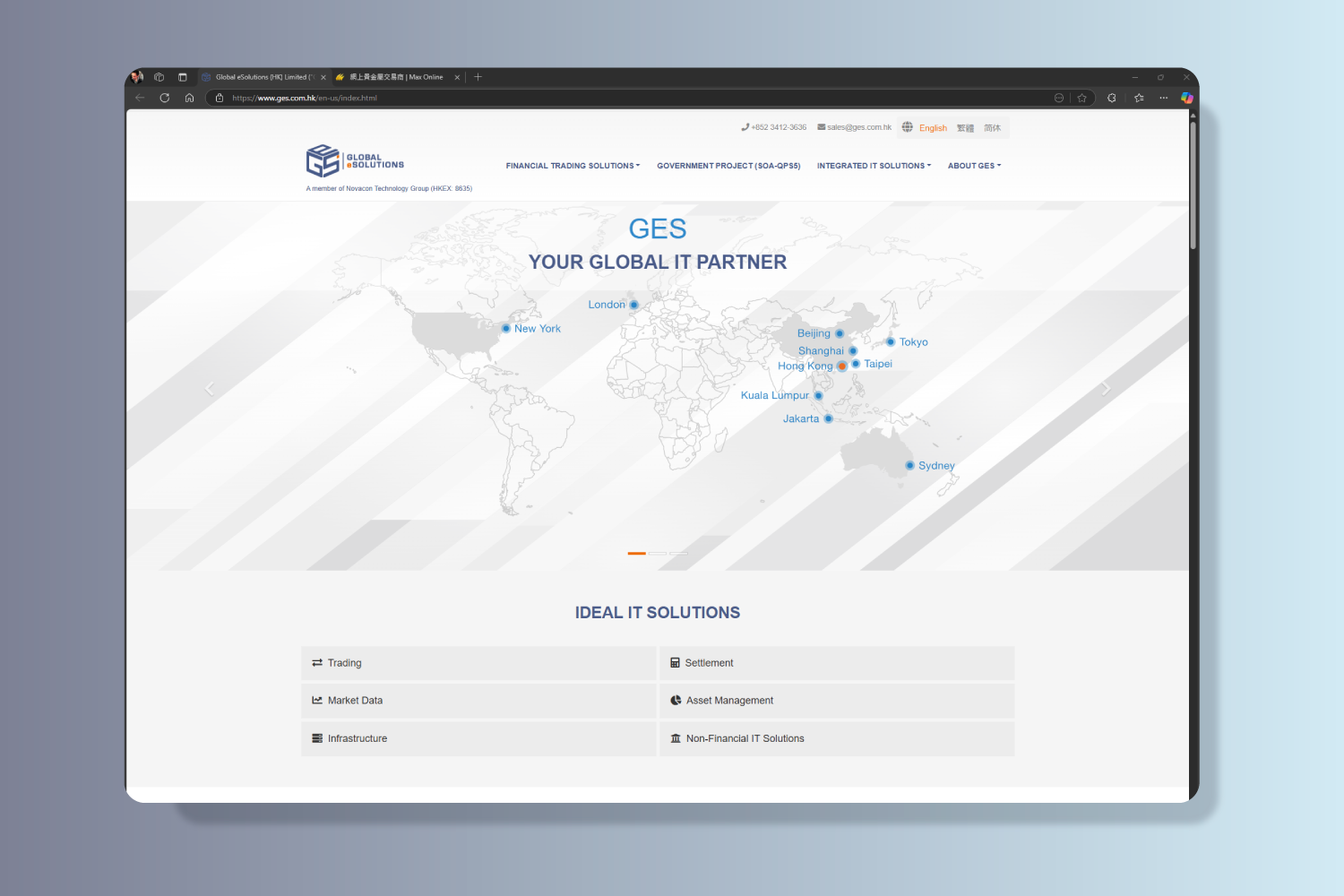 Global eSolutions (HK) Limited (“GES”) (a member of Novacon Technology Group Limited HKEX: 8635) is a well-established IT service provider in Hong Kong. GES is a Hong Kong-based financial trading solution provider principally engaged in the development and provision of financial trading solutions. Their customers are mainly financial institutions, including brokerage firms and wealth management companies, and located mainly in Asia Pacific region, such as Hong Kong, Indonesia, Malaysia, Australia and Japan, as well as Cyprus. They primarily focus on financial trading solutions targeting the trading of OTC-traded financial instruments, stock exchange-traded financial instruments and fund management for wealth management companies.