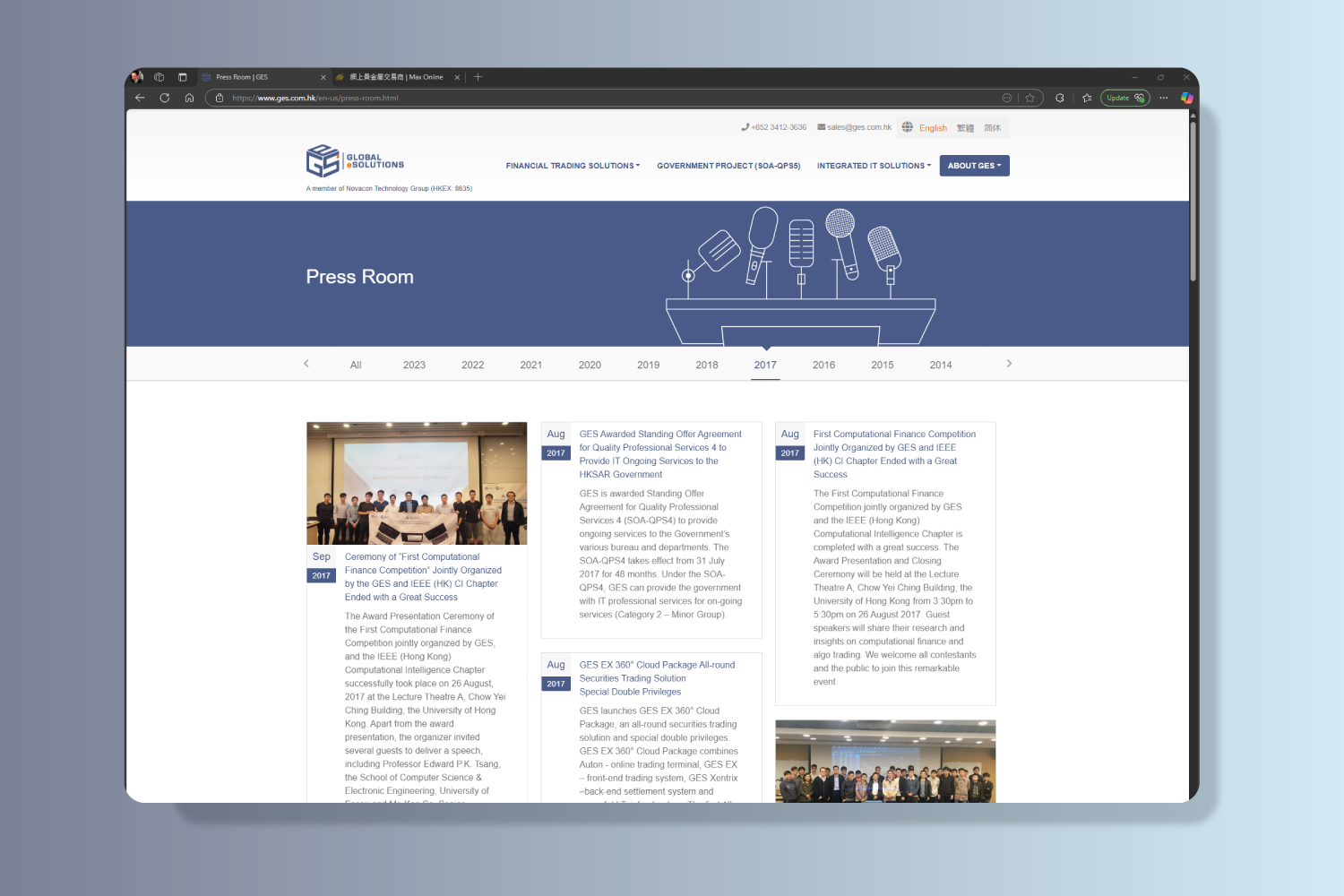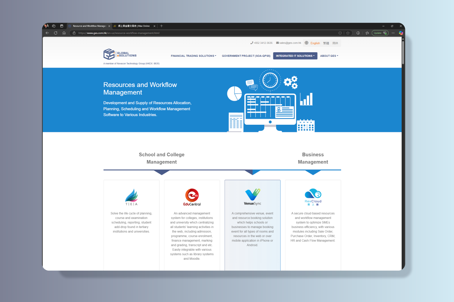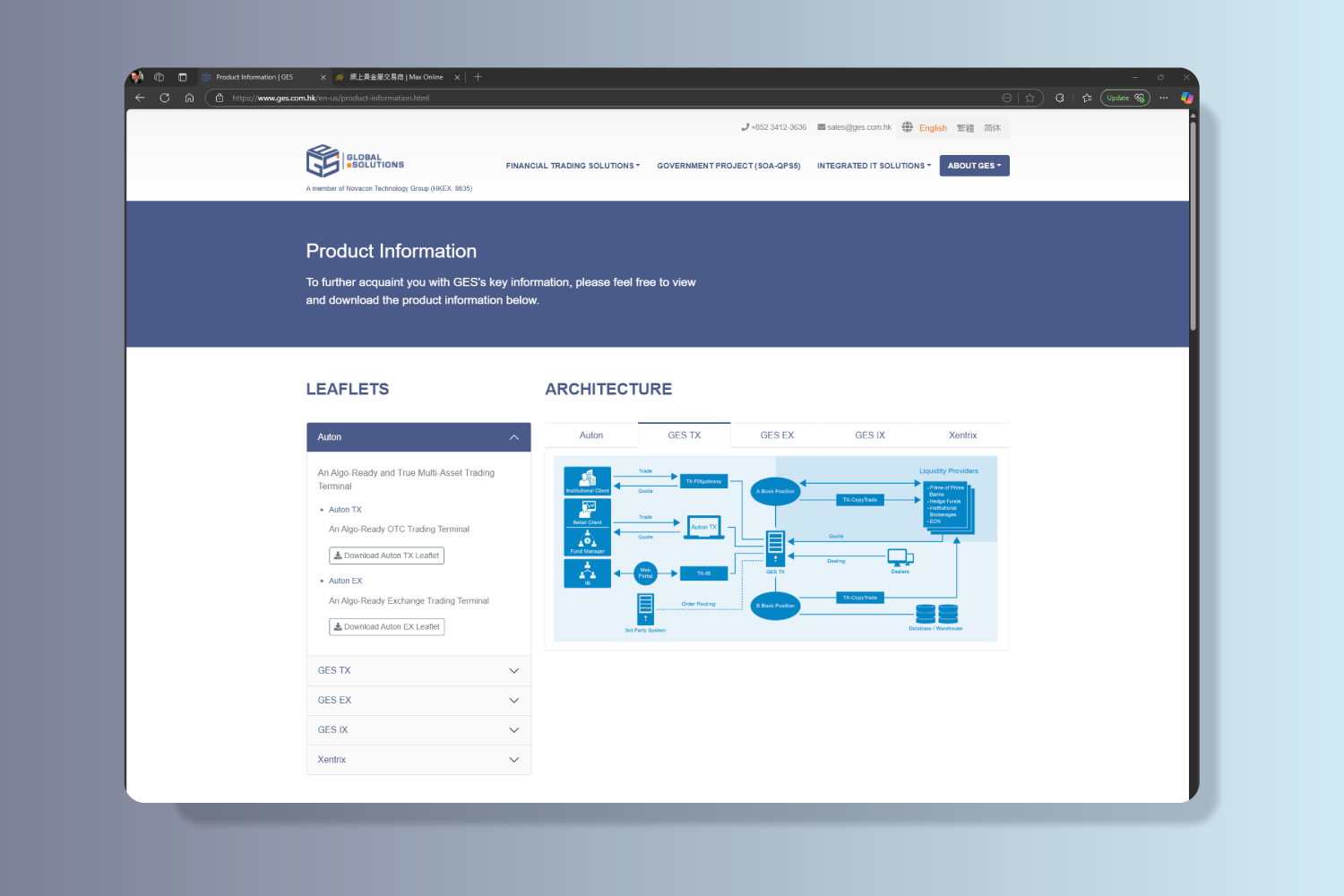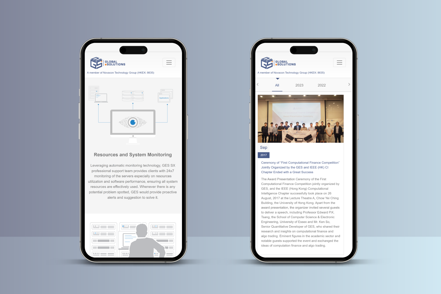 Global eSolutions (HK) Limited (“GES”) (a member of Novacon Technology Group Limited HKEX: 8635) is a well-established IT service provider in Hong Kong. GES is a Hong Kong-based financial trading solution provider principally engaged in the development and provision of financial trading solutions. Their customers are mainly financial institutions, including brokerage firms and wealth management companies, and located mainly in Asia Pacific region, such as Hong Kong, Indonesia, Malaysia, Australia and Japan, as well as Cyprus. They primarily focus on financial trading solutions targeting the trading of OTC-traded financial instruments, stock exchange-traded financial instruments and fund management for wealth management companies.